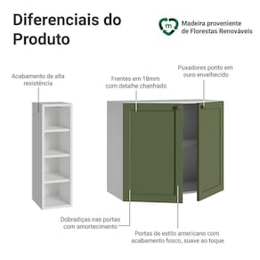 O acabamento de alta resistência da estrutura é em Branco e das frentes em Verde, possui uma textura suave ao toque, trazendo leveza e sofisticação ao ambiente. O destaque fica por conta dos puxadores ponto em ouro envelhecido, feitos com metal resistente, trazem personalidade e um charme único. O detalhe chanfrado das frentes forma molduras delicadas e atemporais, no estilo americano.