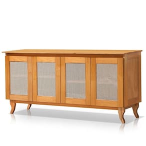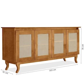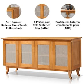 Características do Buffet Aparador de Madeira 4 Portas de Tela Dalton: - Estrutura em madeira pinus taeda de reflorestamento com componetes internos em MDF; - 4 Portas com tela sintética estilo rattan; - Estufada e imunizada; - Peso Suportado por Prateleira: 10kg - Não acompanha objetos decorativos; - Montagem por conta do comprador;