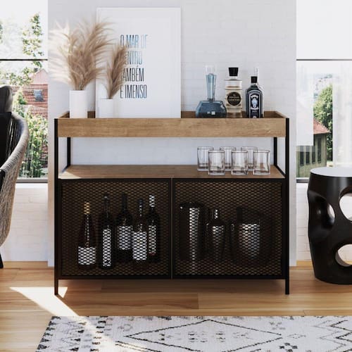 O Balcão Buffet Bar York é moderno, urbano e autêntico, móvel produzido em MDP 15mm com acabamento em BP, as portas são em aço com detalhes em chapa expandida, acabamento em pintura epóxi fosca e fecho magnético. É uma peça multifuncional, pode dar apoio a mesa de jantar no momento de servir as refeições e é também usado para organização do ambiente, a linha York é moderna e tem uma pegada industrial, torna-se a opção ideal para quem gosta de personalidade e praticidade na hora de decorar. Acabamento da Porta: Pintura Acabamento dos Pés: Pintura Ambiente Principal: Sala de Jantar Complexidade da Montagem: Baixa: pode ser montado por uma pessoa sozinha Cor: Vermont/Preto Cor do Produto: Vermont/Preto Cor Interna: Vermont Escala de Brilho: Fosco Escala de Brilho da Porta: Fosco Informações Complementares: Portas com estrutura metálica e chapa expandida em aço com acabamento em pintura epóxi fosca e fecho magnético. Fundo do móvel HDF 3mm. Pés com parafuso para regulagem e capa plástica para evitar atrito do móvel com o piso. O peso suportado considera a Itens Inclusos: 01 Buffet, Kit ferragens, Manual de montagem Linha ou Coleção: York Manual de Montagem e Instalação: https://cdn2.madeiramadeira.com.br/atributo/artesano-moveis/937332-27899-balcao-buffet-bar-100cm-2-portas-york-trama-aco-expandido-industrial-artesano-vermont-preto-m.pdf Material da Porta: Aço Material dos Pés: Aço Material Principal: MDP Necessita Montagem: Sim Origem do Produto: Nacional Pés Reguláveis: Não Peso: 19,75 kg Possui Adega: Não Possui Espelho: Não Possui Nicho: 01 Possui Pés: 04 Possui Portas: 02 Possui Rodízio: Não Recomendações de Uso, Manutenção e Limpeza: Limpar utilizando apenas pano umedecido com água, nunca utilizar produtos químicos ou abrasivos, pois estes danificam o revestimento do móvel. Sapatas Niveladoras: Não Sistema de Montagem: Fixação é feita por parafusos, minifix, cavilhas e pregos, possibilitando a desmontagem do produto sem danificá-lo. Suporta Até (kg): 30 kg Tamanho: Tipo de Dobradiça/Corrediça da Porta: Metálica Tipo de Porta: Bater Tipo de Puxador da Porta: Embutido