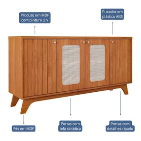 Buffet Aparador Isa 4 Portas Cinamomo Com Tela - Cimol Móveis Cinamomo Buffet Aparador Isa 4 Portas com Tela - Cimol Móveis O Buffet Aparador Isa se destaca pelo design sofisticado, combinando portas centrais com tela sintética, que facilita a limpeza e evita o mofo, e portas laterais com detalhes em baixo relevo. Sua estrutura em MDF com pintura UV garante durabilidade, enquanto o tampo de 25mm e as prateleiras internas oferecem espaço para organização. Os puxadores em ABS e os pés estilo retrô em MDF 25mm complementam o visual refinado. Um móvel versátil para compor sua sala de jantar ou estar com charme e praticidade. ESPECIFICAÇÕES: - Estrutura em MDF - Pintura UV - 4 Portas - Dobradiças metálicas - Portas centrais com tela sintética (fácil limpeza e anti-mofo) - Portas laterais com detalhes em baixo relevo - Interna com prateleiras - Tampo de 25mm - Puxadores em ABS - Pés estilo retrô em MDF 25mm - Amplo espaço interno