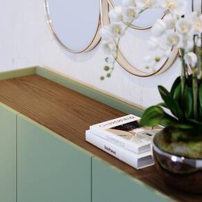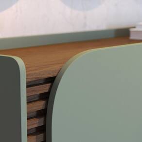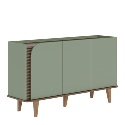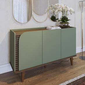 Buffet Aparador Jurerê 3 Portas Hortelã/amêndoa - Colibri Hortelã/amêndoa Buffet Aparador Jurerê 3 Portas - Colibri Encante-se com o Buffet Jurerê, uma harmoniosa combinação de elementos de design retrô e contemporâneo, destacada por seus cinco pés de madeira maciça e formas orgânicas. Os detalhes são realçados pelos elegantes apliques ripados com 20mm de profundidade, enfatizados pela porta de quina usinada. O tampo delicadamente rebaixado, cria a impressão de uma bandeja, conferindo um caráter distintivo ao buffet. Sua base de quinas arredondadas adiciona um toque de suavidade à sua estrutura. Com três portas, seu interior revela prateleiras reforçadas, ideais para a organização de louças. ESPECIFICAÇÕES: - Estrutura em MDP 15mm e 12mm, MDF 15mm, HDF 3mm - Pintura UV - 3 Portas - Dobradiças metálicas - Detalhe ripado - Base com cantos curvos - Lateral com canto curvo - Tampo estilo bandeja - Interna com prateleiras - Pés de madeira maciça