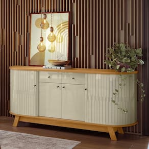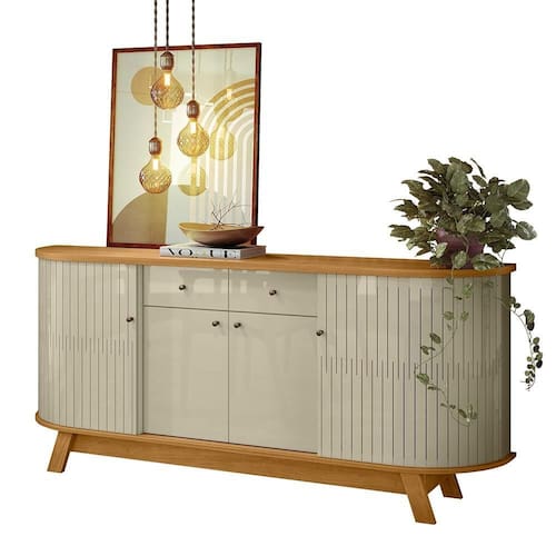 O Buffet Mônaco traz sofisticação e funcionalidade à sala de estar. O detalhe exclusivo da Madetec é a porta curva em MDF, que garante autenticidade, praticidade e um acabamento sofisticado. Possui detalhes curvos no tampo e na base, gavetas com corrediças telescópicas, duas portas com dobradiças metálicas, pés palito, além dos puxadores em bronze que combinam perfeitamente com seu design moderno. É composto por chapas de MDP de 15 e 25mm. Com 183cm de largura, oferece um amplo espaço de armazenamento para utensílios, possuindo gavetas e portas modernas.