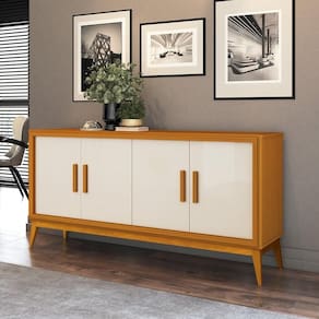 Buffet Aparador Para Sala De Jantar 2 Portas E Com Pés Union Edn Cedro E Off White Complete a sua sala de jantar com a beleza e sofisticação marcante do Aparador de madeira Union. Ele possui um acabamento impecável em Madeira (pinus), que oferece resistência e durabilidade ao móvel. Esse aparador conta com quatro portas de bater com dobradiças metálicas com pressão e puxadores em madeira maciça. Sua pintura com secagem ultra violeta (sete camadas) protege aparador buffet. Seu espaço interno possui 2 prateleiras, para organizar todos seus pertences com facilidade e praticidade. Os pés madeira maciça agregam durabilidade e possibilita que você limpe com facilidade por debaixo do móvel. NA