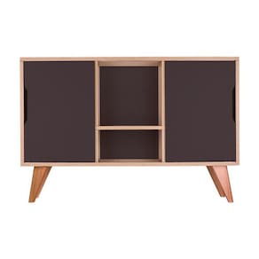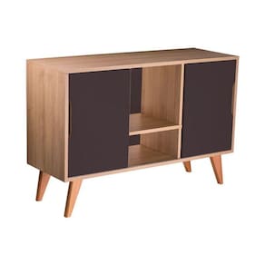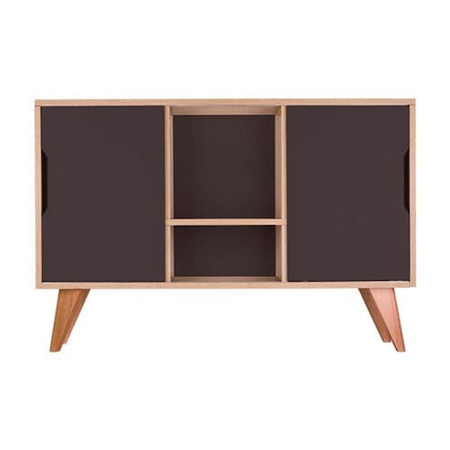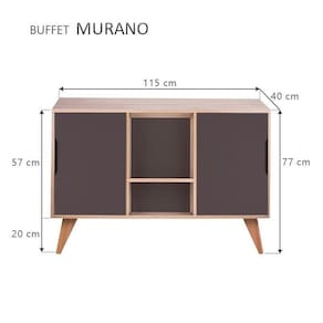 Buffet / Aparador / Balcão Retrô Modelo Murano cor Carvalho Treviso com 2 portas Grafite, o móvel perfeito para deixar seu ambiente com estilo e organizado. Possui dois compartimentos internos com 2 portas laterais e uma prateleira central visível para colocar objetos de decoração. Móvel apoiado em quatro lindos pés torneados em madeira maciça. O móvel apresenta um estilo clean sem puxadores, apenas um recorte nas portas para abrir e fechar. Montagem: Vai desmontado. Cor do Móvel: Madeira Clara (Carvalho Treviso) e portas Grafite. Cor dos pés: Amadeirado de cor clara. Medidas: Largura Total 115cm x Altura Total 77cm x Profundidade Total 40cm, portas A 53cm x L 37cm, pés A 20cm. Material: MDP com espessura 1,5cm . Limpeza: Recomenda-se a limpeza com pano seco ou levemente umedecido. Importante: Este anúncio inclui somente o produto conforme descrição acima. Todos os elementos de decoração das fotos não acompanham o mesmo. Ean: 7897116780970