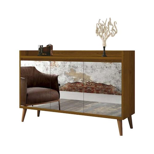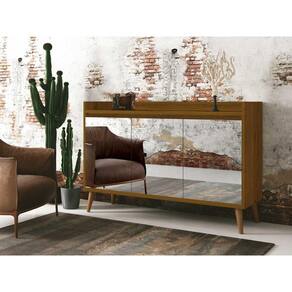 Ideal para organizar melhor sua sala de jantar ou de estar, o Buffet Aparador Retrô com Espelho Delux 3 Portas - MoveisAqui trouxe de volta a pegada retrô que veio para ficar. Os pés estilo palito, levemente angulados, se destacam pelo charme que garante à peça. Seus compartimentos internos são ideais para armazenar e organizar diversos tipos de objetos pessoais, além de seu aparelho de jantar e demais itens que sejam necessários. Lindo, robusto e versátil, garante um espaço moderno e organizado. Dimensões do Produto Montado: Altura: 98,5 cm Largura: 119,5 cm Profundidade: 45 cm Observações: - Produzido em MDP; - 3 portas com dobradiças metálicas; - Pés palito, estilo retrô, em madeira pinus; - Peso suportado por prateleira: até 7kg; - Portas com espelho incluso; - Pintura Ultravioleta com acabamento semi brilho.