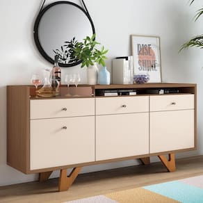 O Buffet Aparador Sollare une sofisticação e funcionalidade para seu ambiente. Com estrutura em MDP e MDF, possui acabamento em pintura UV, garantindo resistência e durabilidade. Seu design conta com duas portas com frisos decorativos alinhadas à gaveta lateral. Com uma gaveta e um gavetão, ambos com corrediças telescópicas, oferece organização e praticidade. A bandeja lateral no estilo bar, com vidro reflecta e espelho, é ideal para armazenar bebidas e acessórios. Os puxadores pontuais na cor champanhe adicionam um toque sofisticado, enquanto os pés de madeira maciça com design exclusivo e acabamento envernizado garantem estabilidade e elegância. Perfeito para compor sua sala de jantar ou estar com estilo.