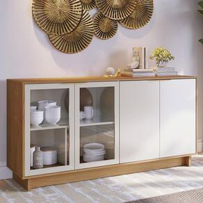 Buffet Aparador Vitória 4 Portas - PR Móveis Com a mistura de elementos minimalista e retrô, o buffet Vitória é um móvel cheio de personalidade e indicado para deixar sua sala de jantar ou estar, ainda mais charmosa. Possui quatro portas, sendo duas em vidro e ambas com três divisórias internas com puxadores metálicos dourados. É ideal para armazenar aparelhos de jantar, travessas e copos. Seu tampo também pode ser utilizado como apoio para objetos decorativos, bebidas ou até mesmo como bancada para acomodar utensílios para servir drinques e petiscos.