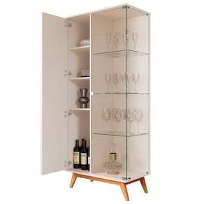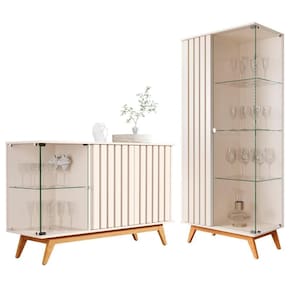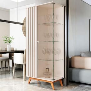 A cristaleira é feita em MDP 24mm. Contém 1 porta com detalhes ripados e 1 de vidro e 3 prateleiras.