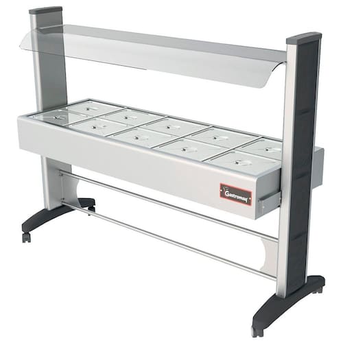 Este buffet vem com rodízios para fácil locomoção e freios para estabilidade quando necessário. Além disso, utiliza um sistema de resfriamento eficiente conhecido como Gelo X. Cada uma das 10 cubas é acompanhada por um gelo rígido médio, que é colocado na cuba para manter os alimentos frios. Este gelo rígido é especialmente projetado para manter uma temperatura baixa por um longo período de tempo, garantindo que os alimentos permaneçam frescos e saborosos durante todo o evento. É uma solução prática e eficaz para manter os pratos frios na temperatura ideal.