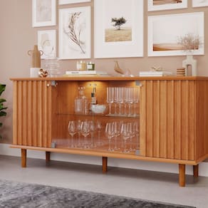 O Buffet Janice é a escolha ideal para quem busca aliar estilo e funcionalidade. Com base em MDF e pés de madeira, combina robustez e elegância. Suas portas laterais apresentam detalhes ripados, trazendo um toque moderno, enquanto as portas centrais de vidro, com prateleiras internas também em vidro, oferecem leveza e sofisticação para exibir seus itens com charme. O LED na parte central valoriza ainda mais o espaço interno, criando uma iluminação sutil e destacando os objetos com um toque contemporâneo. Acabamento da Porta: Pintura UV Acabamento da Prateleira: Pintura UV Acabamento dos Pés: Verniz Altura dos Pés: 16 cm Ambiente Principal: Sala de Jantar Complexidade da Montagem: Média: pode ser montado por mais de uma pessoa e/ou necessite de maior conhecimento para montagem Cor: Cinamomo Cor do Produto: Cinamomo Escala de Brilho: Semi-Brilho Escala de Brilho da Porta: Semi-Brilho Escala de Brilho da Prateleira: Semi-Brilho Itens Inclusos: 01 Buffet + Manual de Montagem Manual de Montagem e Instalação: https://product-hub-prd.madeiramadeira.com.br/972346/documents/8172b019-c7da-4d66-a862-8b21ced20cef2592646503517345460823411.pdf Marca: Cimol Material da Porta: MDF Material da Prateleira: MDF Material do Puxador da Porta: ABS Material dos Pés: Madeira Maciça Material Principal: MDF Montagem Flex: Não Necessita Montagem: Sim Origem do Produto: Nacional Pés Reguláveis: Não Peso: 76,32 kg Peso Máximo por Prateleira: 20 kg Possui Adega: Não Possui Espelho: Não Possui Nicho: Não Possui Pés: 04 Possui Portas: 04 Possui Rodízio: Não Recomendações de Uso, Manutenção e Limpeza: Para manter seu móvel novo por muito mais tempo, evite locais úmidos, mantenha-o distante de líquidos. Para limpá-lo com segurança utilize uma flanela seca sem produtos abrasivos Sapatas Niveladoras: Não Sistema de Montagem: Parafusos, Porcas e Cavilhas. Suporta Até (kg): 40 kg Tipo de Dobradiça/Corrediça da Porta: Metálica Tipo de Madeira Maciça dos Pés: Tauari Tipo de Porta: Bater Tipo de Puxador da Porta: Externo