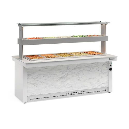Buffet Quente E Frio 10 Cubas Gbtr200br Gelopar Balcão Self Service 10gns Branco E Mármore 220v Buffet Mesa Térmica Refrigerada Linha Vitra GBTR200 Gelopar. Para aquecimento, conservação e exposição de alimentos. Refrigeração: Estática com serpentina embutida no tanque. Aquecimento: Banho maria através de resistência blindada. Temperatura: Aquecimento: +30 a +65C. Refrigeração: 0 a +7C. Revestimento Interno base: Aço pré-pintado, saia e passagem de ar em aço revestido. Revestimento Externo: Tanque: Aço Inox 304. Tampo em vidro com serigrafia. Pés niveladores. Protetor salivar com ajuste de posição em vidro temperado. Tampo em vidro com serigrafia. Capacidade de cubas sugerida: Aquecimento 10GNs 1/2 100mm e Refrigeração 5 GNs 1/2 65mm. Não acompanha Cubas. TEMPERATURA REFRIGERAÇÃO: 0 a +7C/ AQUECIMENTO: +30 a +65C. CONSUMO: 14,90 kWh/dia. PESO: 128,5Kg. DIMENSÕES EXTERNAS(CxAxL): 207,7x155,5/83x155,5cm. Equipamento certificado conforme Portaria Inmetro n 371/2009. Buffet Mesa Térmica Refrigerada Linha Vitra GBTR200 Gelopar é na Atau. Marca - Gelopar Modelo - GBTR200 Quantidade de Cubas - 10Gns Quentes e 5 Frias Frente - 2.07m Altura - 1,55m/mesa 83cm. Profundidade - 1,00m Temperatura - refrigeração 0 a +7C/ aquecimento +30 a +65C Peso - 128,5 Kg Consumo - 14,9 kWh/h