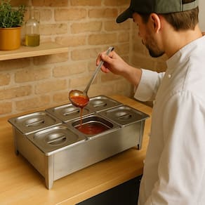 Praticidade e Economia: Funciona em banho-maria com controle uniforme de calor e baixo consumo, facilitando o dia a dia da cozinha profissional.