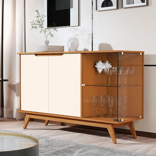 O buffet Tucumã possui estrutura (lateral/tampo/base/prateleira) em MDF 15cm, puxador usinado com design exclusivo, porta/lateral/prateleira de vidro 4cm temperado, alés dos pés e travessas em madeira maciça. Acabamento da Porta: Pintura UV Acabamento da Prateleira: Pintura UV Acabamento dos Pés: Verniz Altura dos Pés: 20 cm Ambiente Principal: Sala de Jantar codigo_ean: 7900288127297 Complexidade da Montagem: Média: pode ser montado por mais de uma pessoa e/ou necessite de maior conhecimento para montagem Cor: Marrom/Offwhite Cor do Produto: Marrom/Offwhite Cor Flex: não Cor Interna: Marrom Escala de Brilho: Brilhante Escala de Brilho da Porta: Brilhante Escala de Brilho da Prateleira: Brilhante Itens Inclusos: 1 Buffet, Kit Ferragens e Manual de Montagem. Linha ou Coleção: Linha 2025 Manual de Montagem e Instalação: https://product-hub-prd.madeiramadeira.com.br/981698/documents/6ab00016-3090-4c9d-acc9-4751b50306752748592540417423064846893.pdf Marca: JB Bechara Material da Porta: MDF Material da Prateleira: MDF Material dos Pés: Madeira Maciça Material Principal: MDF Montagem Flex: não Necessita Montagem: Sim Origem do Produto: Nacional Pés Reguláveis: Não Peso: 36 kg Peso Máximo por Prateleira: 2 kg Possui Adega: Não Possui Espelho: Não Possui Nicho: 04 Possui Pés: 04 Possui Portas: 02 Possui Rodízio: Não Recomendações de Uso, Manutenção e Limpeza: Na remoção da poeira utilize flanela limpa e levemente umedecida. Não exponha à luz solar e locais úmidos. Não encoste o móvel na parede para evitar transmissão de umidade. Sapatas Niveladoras: Não Sistema de Montagem: O produto será entregue desmontado, acompanhado do manual de montagem. Não oferecemos serviço de montagem. A montagem e instalação é por conta do cliente. Recomendamos a contratação de um profissional. Não nos responsabilizamos por danos decorrentes a e Suporta Até (kg): 20 kg Tipo de Dobradiça/Corrediça da Porta: Metálica Tipo de Madeira Maciça dos Pés: Pinus Tipo de Porta: Bater Tipo de Puxador da Porta: Embutido