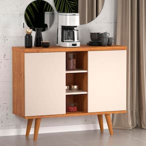 O Buffet Ulisses conta com duas prateleiras centrais que suportam até 3kg cada, perfeitas para organizar utensílios ou acessórios menores. Além disso, possui duas prateleiras laterais que suportam até 5kg, oferecendo espaço adicional para armazenamento. Seus quatro pés de plástico em estilo retrô conferem um charme especial, tornando-o não apenas prático, mas também estiloso.
