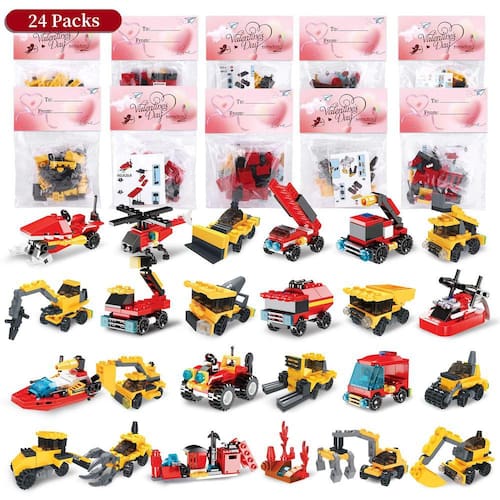 Pacote com 24 presentes de Dia dos Namorados para crianças, caminhões de bombeiros e blocos de construção para veículos de construção, blocos perfeitos de alta qualidade, presentes de Dia dos Namorados para crianças em sala de aula, lembrancinhas de festa para meninos e meninas de 3 anos