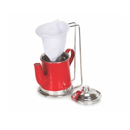 Medidas do Bule: (AxDxE) 10,5 cm X 7 cm X 1 mm Capacidade: 250 ml Material do Bule: Alumínio Material do Suporte: Metal Material do Coador: 100% algodão Disponível em vermelho Peso aprox. Produto: 130g
