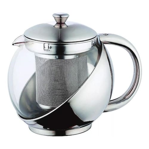 Bule para chá de vidro e inox. Produto multifuncional. Faça chá ou café diretamente na jarra utilizando o infusor interno. Pode ser utilizado para outras bebidas tais quais e sucos, água, etc. Fácil de limpar. Ideal para vários ambientes. Design moderno e sofisticado. Suporte, alça e tampa em aço inox, jarra em vidro. Capacidade: 800 ml. Altura 12,5 cm; diâmetro 12 cm. Peso 220 g. Não vai ao fogo.