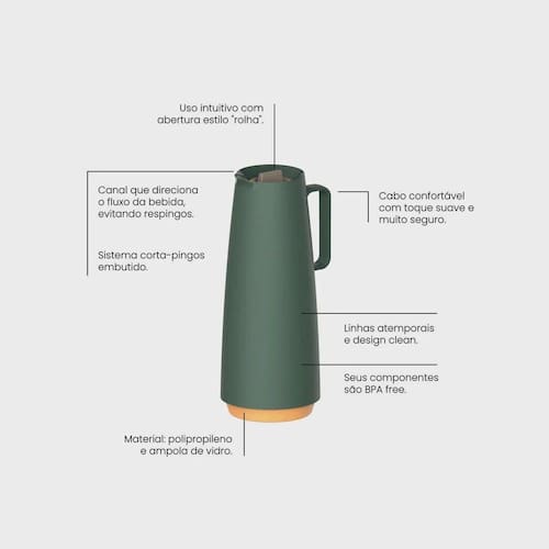 - Sua utilização é primorosa, pois ele conta com canal para um perfeito direcionamento da bebida. O bule é leve, ocupa menor espaço em sua cozinha e tem selo IF Design que garante alta qualidade!