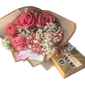 Buquê de 6 rosas e chocolates (os chocolates podem ser Heart's Ferrero Rocher ou Gulyan) Flores is opcionais, cartão de mensagem (indique) sem custo adicional. Fita de tecido opcional com o nome gravado (indique o nome) sem custo adicional. Tudo embrulhado em um lindo papel