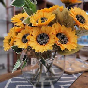 -Flores exuberantes: Com 5 girassóis de tamanho equilibrado, traz um efeito volumoso e elegante.