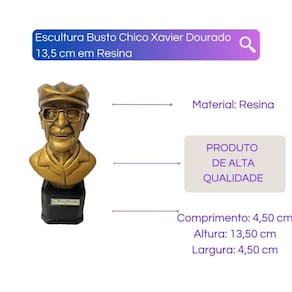 O Busto Chico Xavier ou Bezerra Menezes em Resina da Bialluz é uma escultura com muito valor espiritual, e possui muita fé envolvida. Tem detalhes minuciosos e uma pintura maravilhosa que ressalta toda a escultura. Por ser confeccionada em resina tem alta qualidade e resistência. Carregada de fé e paz, trará ótimas energias para sua vida e dará muita luz no seu caminho