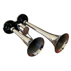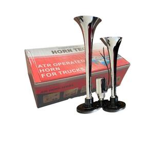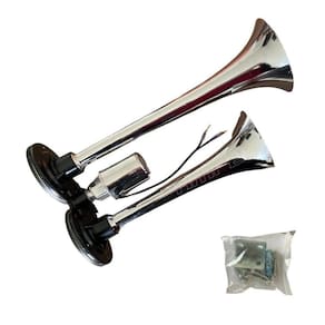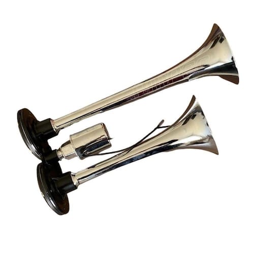 Cor disponível: Cromado especificação técnica: Compatibilidade universal Tensão de operação: 12v / 24v Intensidade: 105 - 118 db; Não acompanha botão Fabricado em plástico resistente Com cromo de alta qualidade Fácil instalação Comprimento das cornetas: 29cm e 23,7cm Dimensões da válvula solenóide (dxl): 3,5x6cm