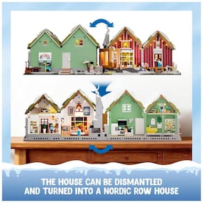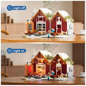 O kit Lumibricks Cabana Spa Inverno contém 2235 peças plásticas ABS inspiradas na arquitetura nórdica islandesa de casas de turfa e sobrados coloridos, recriando estrutura de fileira com fachadas frontal e traseira contrastantes separáveis para disposição lado a lado. O design modular permite exibição dupla: frente com atividades de spa e verso com cena de hóquei no gelo, otimizando visualização e narrativa criativa.
