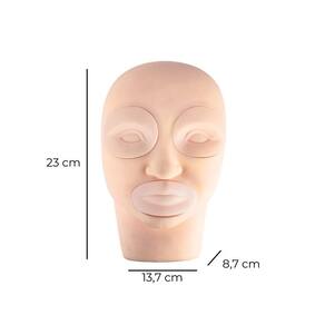 Contém: 01 - cabeça emborrachada 01 - boca removível 02 - olhos removíveis A cabeça manequim emborrachada com olhos e boca removíveis, composta por um formato anatômico realista em tamanho natural, simulando fielmente os contornos do rosto humano. É feita de material resistente, macio e com acabamento liso, com coloração bege. Os olhos e a boca são regiões destacáveis, moldadas com detalhes que permitem treinamento preciso em técnicas de estética, maquiagem, aplicação de cílios, de lábios e sobrancelhas, design de sobrancelhas. A estrutura é estável e firme, com base reta para uso sobre mesas ou bancadas, tornando-a ideal para simulações práticas em cursos e treinamentos profissionais. Muito utilizada e indicada para apresentar o passo a passo de procedimentos com fidelidade anatômica. Características principais: - olhos e boca removíveis; - material firme com acabamento liso; - indispensável para profissionais da beleza; - auxilia em treinamentos; - perfeita para maquiadores, micropigmentadoras, lash designers, designers de sobrancelha e muito mais; - volume e formato realista; - base reta estável; - alta durabilidade. Medidas: 23 x 13,7 x 8,7 centímetros a x l x p .