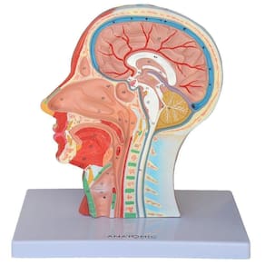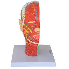 Metade da Cabeça com Musculatura em Corte Mediano. Modelo anatômico da cabeça em corte mediano, mostra estrutura muscular superficial externa, com vasos sanguíneos e ramificações nervosas; mostra também estrutura interna da cabeça, evidenciando o cérebro, cerebelo, medula espinhal, cavidade nasal, palato e partes adjacentes. Confeccionado em resina plástica de alta qualidade, colorido a mão.