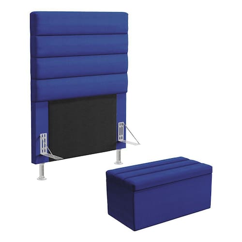 O Kit Cabeceira Atlas foi inspirada para você, ela possui um design clássico, perfeita para seu espaço, possui também detalhes modernos na horizontal e um ótimo acabamento, tudo isso com ótimo custo benefício. Possui dois pés de 12 cm e fixação via frames para a sustentação do box, não sendo necessário furar a sua cama, apenas encaixa-la nos suportes da cabeceira. Junto com a Calçadeira Ursa que possui uma ótima capacidade de armazenamento interno, podendo armazenar cobertores, almofadas, entre outros. Adquira já! Dimensões da CabeceiraLargura: 90 cmAltura: 127 cmProfundidade: 10 cmPeso: 10 KgDimensões da CalçadeiraLargura: 92 cmAltura: 45 cmProfundidade: 46 cmPeso: 10 KgDimensões do Produto embaladoVolume 1Largura: 92 cmAltura: 129 cmProfundidade: 12 cmPeso: 12 kgVolume 2Largura: 92 cmAltura: 47 cmProfundidade: 48 cmPeso: 12 kgCaracterísticas do Produto:Madeira de eucalipto proveniente de reflorestamentoFixação com grampos galvanizadosEspuma Poliuretano D20Revestimento: CouroCor: AzulTamanho: Solteiro para cama box de 88 cmPossui pés: SimTipo de pés: 2 pés PVC de 12 cm e 4 sapatasEmbalagem: plástico bolha, papelão ondulado, malha, plásticoFixação diretamente no box através de framesGarantia de 3 meses contra defeitos de fábrica.Diferenciais: - Madeira de alta qualidade- Design moderno- Material resistente- Ótimo acabamento- Estrutura reforçadaSistema de Montagem: O produto é enviado montado, sendo necessário apenas a fixação dos frames e pés.Manual de Montagem: SimVolume: 2 VolumesMontagem: Recomendamos que seja feita por um profissionalRecomendação de Limpeza: Utilize pano levemente úmidoObservações importantes- Produto para uso residencial em ambiente interno, não devendo ficar exposto diretamente ao sol, calor e umidades excessivas.- Pode haver alguma diferença de tonalidade entre a imagem e o produto real, por conta do tratamento de imagens e a calibração de cores do seu monitor.- As imagens são meramente ilustrativas, não acompanham objetos de decoração e eletrônicos.