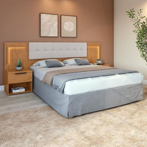 Com um acabamento sofisticado e mesas de cabeceira que facilitam o acesso a itens essenciais, esta cabeceira é a solução ideal para quem valoriza a praticidade sem abrir mão do estilo. Os nichos e gavetas oferecem espaço extra para organização, enquanto as luzes de LED no painel adicionam um toque especial à sua decoração.
