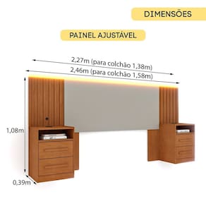 As 4 gavetas com corrediças telescópicas oferecem espaço ideal para organização. Com largura ajustável de 227cm a 246cm, ela se adapta perfeitamente a colchões de 138cm e 158cm, garantindo um visual harmonioso. A cabeceira une estética, funcionalidade e durabilidade para trazer conforto. Produto Montado: Sim Acabamento da Mesa de Cabeceira: Pintura Ambiente Principal: Quarto Cabeceira Estofada: Não codigo_ean: 7900288226655 Complexidade da Montagem: Média: pode ser montado por mais de uma pessoa e/ou necessite de maior conhecimento para montagem Cor: Cinamomo/ Off White Cor do Produto: Cinamomo/ Off White Escala de Brilho: Fosco Escala de Brilho da Mesa de Cabeceira: Fosco Extensível: Sim Fixação Box: Não Fixação na Parede: Não Informações Complementares: Produto com Led e Entrada USB Itens Inclusos: 1 Painel, 2 Mesas de Cabeceira, Kit de Ferragem e Manual de Montagem Largura do Colchão Indicado: 138cm/158cm Largura Máxima: 2,46 cm Largura Mínima: 2,27 cm Linha ou Coleção: Ripado Manual de Especificação Técnica: https://product-hub-prd.madeiramadeira.com.br/262861318/documents/a5548681-a480-40f7-abe5-0ae47701270a317612447717568256515564.pdf Manual de Montagem e Instalação: https://product-hub-prd.madeiramadeira.com.br/262861318/documents/5eef980b-96b5-45f1-8178-d90e1b84a5d7319656647717576044108909.pdf Marca: Espresso Móveis Material da Mesa de Cabeceira: MDP Material Principal: MDP Necessita Montagem: Sim Origem do Produto: Nacional Peso: 43,4 kg Possui Baú: Não Possui Espelho: Não Possui Mesa de Cabeceira: 02 Possui Pés: Não Possui Vidro: Não Recomendações de Uso, Manutenção e Limpeza: A limpeza do móvel deve ser efetuada somente com pano macio e seco. Não utilizar produtos abrasivos ou similares, tais como: Cera, álcool, detergentes, tinner, lustra móveis, entre outros. Sistema de Montagem: Parafusos, cavilhas e minifix Tipo de Colchão: Casal/Queen
