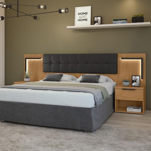 Características: Produto em MDP; Ideal para colchões de 1580mm; Painel com luzes de LED; Painel da cabeceira estofado em corino; 02 mesas de cabeceira acopladas; Tampo da mesa de cabeceira com 25 mm; 02 nichos; 02 gavetas; Gavetas com corrediças telescópicas; Puxador das gavetas em alumínio; Vantagens/Benefícios: Produzido com equipamentos de alta tecnologia; Produto avaliado e aprovado por um rigoroso controle de qualidade; Fácil montagem e manual simplificado; Tamanho ideal para colchões de 1580mm; Acabamento com toque aveludado; 02 mesas laterais; 02 nichos para acomodar objetos; 02 gavetas com corrediças telescópicas; Painel com opção de luzes de LED. Com opções de luzes de LED no painel, a Cabeceira Calitan reforça o estilo e a personalidade dos dormitórios. Além disso, possui mesas de cabeceira acopladas que dão muito mais praticidade ao dia a dia. COR: AMÊNDOA CLEAN/PRETO FOSCO | Fabricante: Móveis Lopas