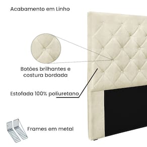 Dormir bem e manter-se seguro na hora de relaxar são fatores importantes que influenciam na qualidade do sono. Unir esses pontos com uma decoração incrível seria perfeito, não é mesmo? Que tal começar essa mudança pela cabeceira da sua cama!? A Cabeceira Tania sem dúvida vai roubar a cena de tão linda e aconchegante! A estrutura é feita em madeira de eucalipto, uma opção que ressalta a durabilidade e beleza da peça. A cabeceira é preenchida com espuma D23, garantindo um conforto ideal para noites mais tranquilas. Este modelo é indicado para Cama Box Casal de 140 cm, contém costura bordada em losangos com botões brilhantes que conferem uma textura maleável e um visual refinado. O revestimento foi feito no Linho, um tecido de alta qualidade no tom Natural perfeita para criar uma atmosfera mais aconchegante ao local. As sapata são de plástico além de serem muito resistentes garantem maior flexibilidade e sustentação à peça. E não menos importante acompanha frame em metal que é o suporte ideal para fixar a cabeceira na cama box. O design desta peça apresenta um elemento estético sofisticado, que transformará instantaneamente o ambiente e impedirá que a passagem de temperaturas (frio/quente) que se concentram na parede, passem diretamente para o usuário. A Cabeceira Tania é a opção mais adequada para o seu dormitório, afinal de contas você merece o que há de melhor para completar a decoração da sua casa. Adquira a Cabeceira Tania antes que acabe o estoque!