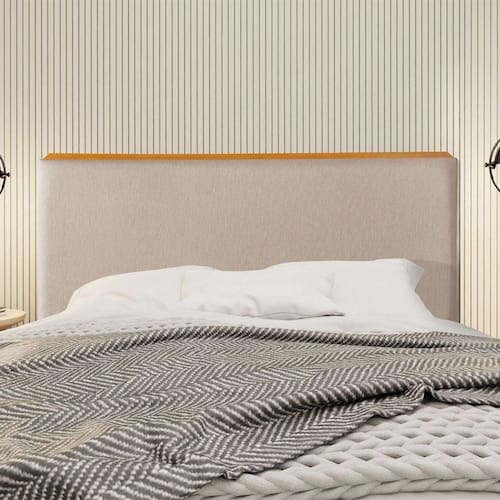 AS IMAGENS SÃO MERAMENTE ILUSTRATIVAS E PODEM SOFRER VARIAÇÕES DE COR E PEQUENOS DETALHES DE ACORDO COM O SEU MONITOR, ILUMINAÇÃO DO AMBIENTE E ATÉ MESMO A SUA PERCEPÇÃO VISUAL.Cabeceira Cama Box Casal 1,40m Estofada Detalhe em Madeira Java Linho Bege