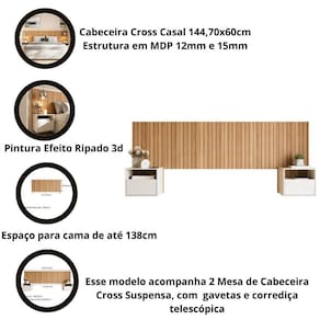 Cabeceira Box Casal 1.45 Efeito Ripado C/ 2 Mesas de Cabeceira Suspensa Cross Freijó - Movelove
