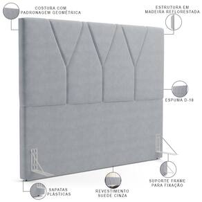 Características do Produto Material da estrutura: Madeira de Eucalipto. Material e Densidade da Espuma: Espuma D18. Revestimento: Suede. Possui Pés: Sim. Tipo de Pés: Sapatas Plásticas. Possui Frame: Sim. É adequado para cama box: Sim. Acompanha Mesa de Cabeceira: Não. Diferenciais: - Design moderno. - Para ter acesso ao frame, é necessário verificar a parte interna e traseira da Cabeceira. Sistema de Montagem: O produto é enviado montado, sendo necessário apenas a fixação do frame. Manual de Montagem: Não. Complexidade da Montagem: Baixa. Conteúdo da Embalagem: 1 Cabeceira. Volumes: 1 Volume. Garantia do Fabricante: 90 dias contra defeitos de fabricação. Montagem: Recomendamos que seja feita por um profissional. Recomendação de limpeza: Utilize pano levemente úmido.