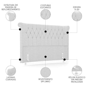 Características do Produto Material da estrutura: Madeira de reflorestamento. Material do Enchimento: Espuma D-20. Revestimento: Linho. Possui Pés: Sim. Tipo dos Pés: plásticos Metalizados. Possui Frame: Sim. É adequado para cama box: Sim. Tamanhos de cama: Casal Queen. Acompanha Mesa de Cabeceira: Não. Acompanha colchão: Não. Diferenciais: - Design orgânico. - Costuras Elegantes. - Pés com altura de 6cm evitam o contato direto com o chão e umidade. Sistema de Montagem: O produto é enviado montado. Manual de Montagem: Não. Complexidade da Montagem: Baixa. Volumes: 1 Volume. Conteúdo da Embalagem: 1 Cabeceira. Garantia do Fabricante: 90 dias contra defeito de fabricação. Montagem: Recomendamos que seja feita por um profissional. Recomendação de Limpeza: Utilize pano levemente úmido.