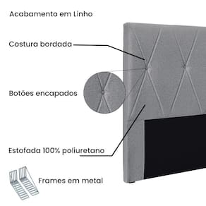 Dormir bem e manter-se seguro na hora de relaxar são fatores importantes que influenciam na qualidade do sono. Unir esses pontos com uma decoração incrível seria perfeito, não é mesmo? Que tal começar essa mudança pela cabeceira da sua cama!? A Cabeceira Aquilla sem dúvida vai roubar a cena de tão linda e aconchegante! A estrutura é feita em madeira de eucalipto, uma opção que ressalta a durabilidade e beleza da peça. A cabeceira é preenchida com espuma D23, garantindo um conforto ideal para noites mais tranquilas. Este modelo é indicado para Cama Box Queen de 160 cm, contém costura em losangos com botões encapados que conferem uma textura maleável e um visual refinado. O revestimento foi feito no Linho, um tecido de alta qualidade perfeito para criar uma atmosfera mais aconchegante ao local. As sapata são de plástico além de serem muito resistentes garantem maior flexibilidade e sustentação à peça. E não menos importante acompanha frame em metal que é o suporte ideal para fixar a cabeceira na cama box. O design desta peça apresenta um elemento estético sofisticado, que transformará instantaneamente o ambiente e impedirá que a passagem de temperaturas (frio/quente) que se concentram na parede, passem diretamente para o usuário. A Cabeceira Aquilla é a opção mais adequada para o seu dormitório, afinal de contas você merece o que há de melhor para completar a decoração da sua casa. Adquira a Cabeceira Aquilla antes que acabe o estoque!
