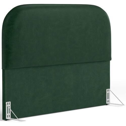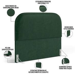 Características da Cabeceira: Estrutura em madeira de reflorestamento de eucalipto. Revestimento em Couríssimo na cor Verde Estofamento com espuma D-18 para maior conforto e maciez. Design curvo, estilo orgânico. Pés sapatas plásticas.