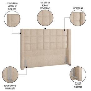 Características do Produto Material da estrutura: Madeira de Eucalipto. Material do Forro: Kami TNT. Densidade da Espuma do Painel: Espuma D20. Revestimento: Bouclé. Possui Pés: Sim. Tipo de Pés: Sapatas Plásticas. Possui Frame: Sim. É adequado para cama box: Sim. Tamanhos de cama: Queen. Acompanha Mesa de Cabeceira: Não. Acompanha Colchão: Não. Diferenciais: - Design moderno. - Costura em formas geométricas. - Para ter acesso ao frame, é necessário verificar a parte interna e traseira da Cabeceira. Sistema de Montagem: O produto é enviado montado, sendo necessário apenas a fixação do frame. Manual de Montagem: Não. Complexidade da Montagem: Baixa. Conteúdo da Embalagem: 1 Cabeceira. Volumes: 1 Volume. Garantia do Fabricante: 90 dias contra defeitos de fabricação. Montagem: Recomendamos que seja feita por um profissional. Recomendação de limpeza: Utilize pano levemente úmido.