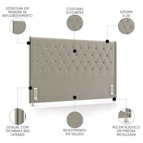 Características do Produto Material da estrutura: Madeira de reflorestamento. Material do Enchimento: Espuma D-20. Revestimento: Veludo. Possui Pés: Sim. Tipo dos Pés: Plástico Metalizado. Possui Frame: Sim. É adequado para cama box: Sim. Tamanhos de cama: Solteiro. Acompanha Mesa de Cabeceira: Não. Acompanha colchão: Não. Diferenciais: - Design orgânico. - Costuras Elegantes e detalhes com tachinhas nas laterais. - Pés com 6cm de altura que evitam o contato direto com o chão e umidade. Sistema de Montagem: O produto é enviado montado. Manual de Montagem: Não. Complexidade da Montagem: Baixa. Volumes: 1 Volume. Conteúdo da Embalagem: 1 Cabeceira. Garantia do Fabricante: 90 dias contra defeito de fabricação. Montagem: Recomendamos que seja feita por um profissional. Recomendação de Limpeza: Utilize pano levemente úmido.