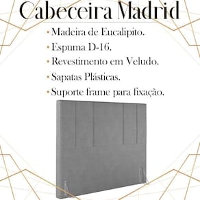Cabeceira Casal 138 cm Madrid Veludo, ideal para inovar o seu quarto com toque luxuoso e ao mesmo tempo refinado. Estrutura em madeira de eucalipto, que oferece maior durabilidade ao produto. Composta por revestimento em tecido veludo, conta com espuma D-16 de altíssima qualidade, sapatas plásticas e acompanha frames para facilitar a fixação no box, é ideal para colchão Casal de 138 cm. Unindo elementos do design contemporâneo, que proporcionam uma ambientação moderna e com acabamentos sofisticados. Este móvel chegará na sua casa separado em 01 volume.