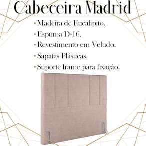 Cabeceira Casal 138 cm Madrid Veludo, ideal para inovar o seu quarto com toque luxuoso e ao mesmo tempo refinado. Estrutura em madeira de eucalipto, que oferece maior durabilidade ao produto. Composta por revestimento em tecido veludo, conta com espuma D-16 de altíssima qualidade, sapatas plásticas e acompanha frames para facilitar a fixação no box, é ideal para colchão Casal de 138 cm. Unindo elementos do design contemporâneo, que proporcionam uma ambientação moderna e com acabamentos sofisticados. Este móvel chegará na sua casa separado em 01 volume.