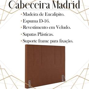 Cabeceira Casal 138 cm Madrid Veludo, ideal para inovar o seu quarto com toque luxuoso e ao mesmo tempo refinado. Estrutura em madeira de eucalipto, que oferece maior durabilidade ao produto. Composta por revestimento em tecido veludo, conta com espuma D-16 de altíssima qualidade, sapatas plásticas e acompanha frames para facilitar a fixação no box, é ideal para colchão Casal de 138 cm. Unindo elementos do design contemporâneo, que proporcionam uma ambientação moderna e com acabamentos sofisticados. Este móvel chegará na sua casa separado em 01 volume.
