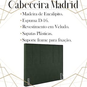 Cabeceira Casal 138 cm Madrid Veludo, ideal para inovar o seu quarto com toque luxuoso e ao mesmo tempo refinado. Estrutura em madeira de eucalipto, que oferece maior durabilidade ao produto. Composta por revestimento em tecido veludo, conta com espuma D-16 de altíssima qualidade, sapatas plásticas e acompanha frames para facilitar a fixação no box, é ideal para colchão Casal de 138 cm. Unindo elementos do design contemporâneo, que proporcionam uma ambientação moderna e com acabamentos sofisticados. Este móvel chegará na sua casa separado em 01 volume.
