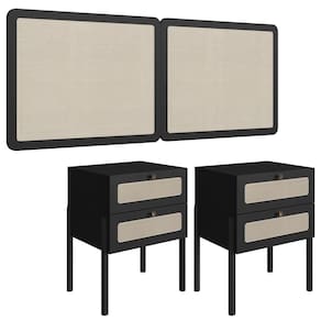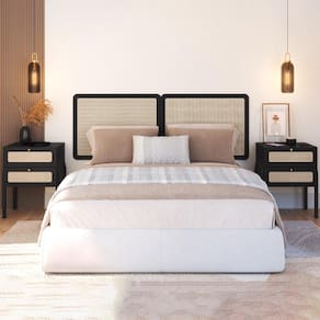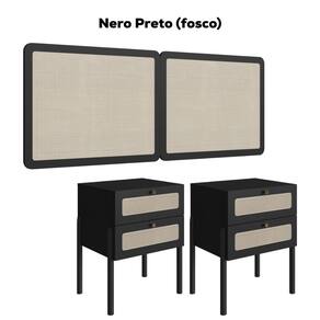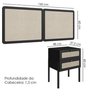 MDPCabeceira e 2 Mesas de Cabeceira 27978, o conjunto ideal para deixar seu quarto mais elegante. Produzido em madeira maciça Eucalipto e MDP 15 mm com acabamento BP. As mesas contam com gavetas com corrediças metálicas, puxadores em poliestireno dourado e detalhes em tela sintética (PVC) imitando palhinha, também presentes na cabeceira. Possui ainda sapatas emborrachadas que evitam atrito com o piso. Atende aos padrões Casal e Queen Size. Produto entregue em 5 volumes.