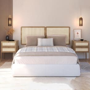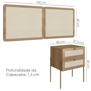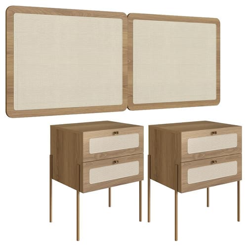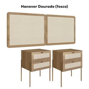 MDPCabeceira e 2 Mesas de Cabeceira 28978, o conjunto ideal para deixar seu quarto mais elegante. Produzido em tubo metálico em aço com pintura epóxi dourada e MDP 15 mm com acabamento BP. As mesas possuem gavetas com corrediças metálicas, puxadores em poliestireno dourado e detalhes em tela sintética (PVC) imitando palhinha, também presentes na cabeceira. Conta ainda com ponteiras plásticas que evitam atrito com o piso. Atende aos padrões Casal e Queen Size. Produto entregue em 5 volumes.
