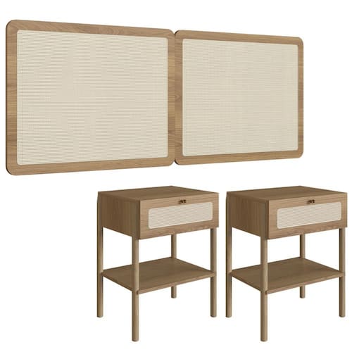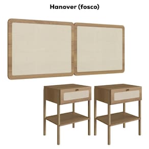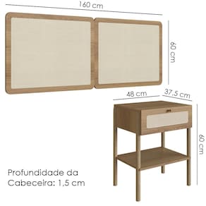 Cabeceira e 2 Mesas de Cabeceira 27977, o conjunto ideal para deixar seu quarto mais elegante. Produzido em madeira maciça Eucalipto e MDP 15 mm com acabamento BP. As mesas possuem gavetas com corrediças metálicas, puxadores em poliestireno dourado e detalhes em tela sintética (PVC) imitando palhinha, presentes também na cabeceira. Conta ainda com sapatas emborrachadas que evitam atrito com o piso. Atende aos padrões Casal e Queen Size. Produto entregue em 5 volumes.