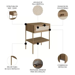 Características do Produto Material da estrutura: MDP 15mm/HDF 3mm. Peso Suportado: 11 Kg distribuídos. Acabamento: BP. Escala de Brilho: Fosco. Possui Pés: Sim. Material dos Pés: Aço metálico. Possui Gaveta: Sim. Quantidade de Gavetas: 2 Gavetas. Tipo de Corrediças: Metálicas. Possui Puxador: Sim. Material do Puxador: Poliestireno. Possui Nicho: não. Possui Porta: Não. Possui Prateleira: Sim. Quantidade de Prateleira: 2 Prateleiras. Diferenciais: - Design retrô. - Detalhes de tela sintética. - Intalacão da cabeceira facilitada com suporte metálico. - Cabeceira painel. - Cantos arredondados. - Indicada para colchão queen. Sistema de Montagem: Minifix/Cavilhas/Parafusos. Manual de Montagem: Sim. Complexidade da Montagem: Média. Conteúdo da Embalagem: 1 Cabeceira/ 2 Mesas de Cabeceiras. Volumes: 5 Volumes. Garantia do Fabricante: 90 dias contra defeitos de fabricação. Montagem: Recomendamos que seja feita por um profissional. Recomendação de limpeza: Utilize pano levemente úmido.